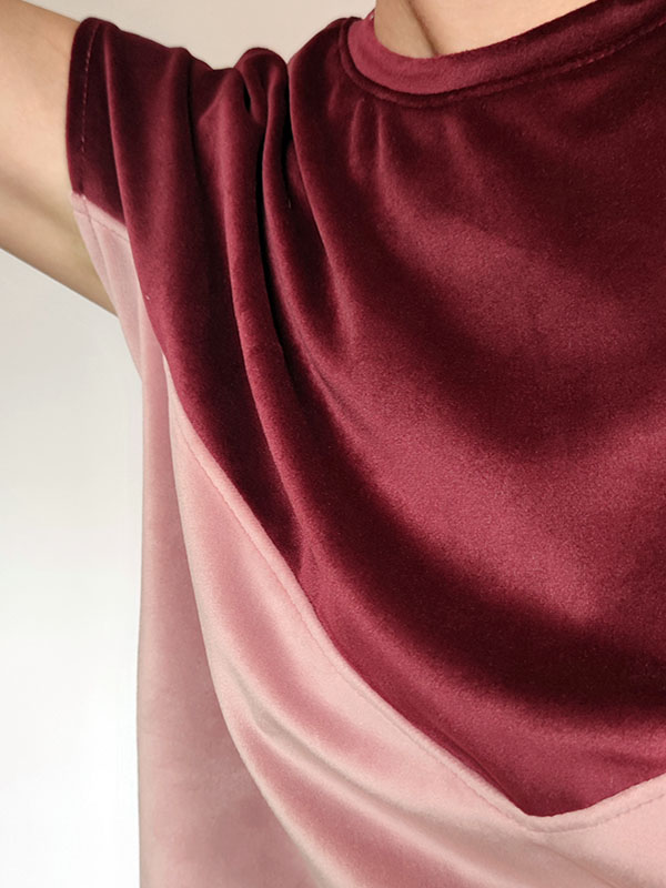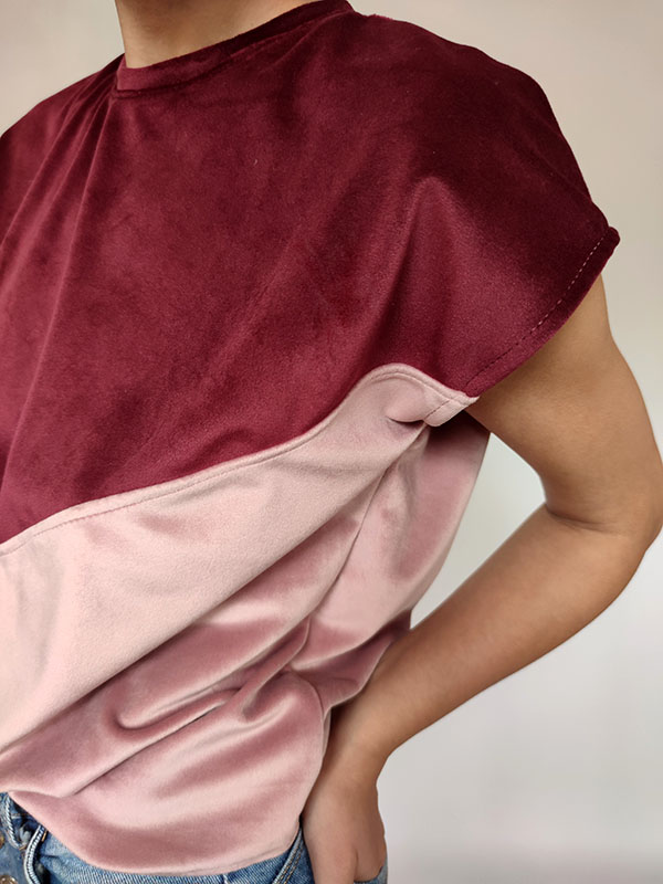 Dzianina, z której uszyliśmy koszulkę Alya, to wysokiej jakości welur. Gruby i mięsisty włos o delikatnym połysku. Welur jest bardzo przyjemny dla ciała, wyjątkowo komfortowy. Dzianina jest elastyczna, Alya nie będzie krępować Twoich ruchów. W tej koszulce będzie Tobie bardzo wygodnie.