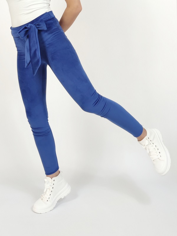 Nietuzinkowe chabrowe legginsy wykonane z bardzo eleganckiego weluru. W pasie zamontowana fantastyczna wstążka, którą możesz przewiązać w dowolnym miejscu (po bokach lub na środku, jeśli masz taką fantazję, to nawet z tyłu!) i w dowolny sposób. Dzięki wiązaniu welurowe legginsy z kokardą chabrowe, to nie są już tylko legginsy, ale genialna baza do super stylizacji.